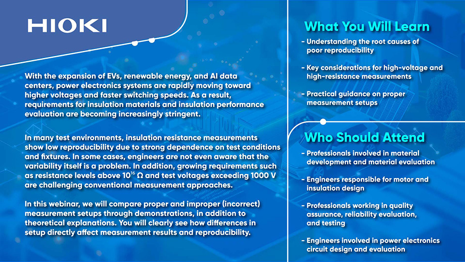 This technical webinar focuses on the key factors affecting insulation resistance measurement reproducibility in high-voltage and high-resistance testing applications. The webinar is designed as a technical knowledge-sharing session, combining theory with practical demonstrations to help engineers better understand: