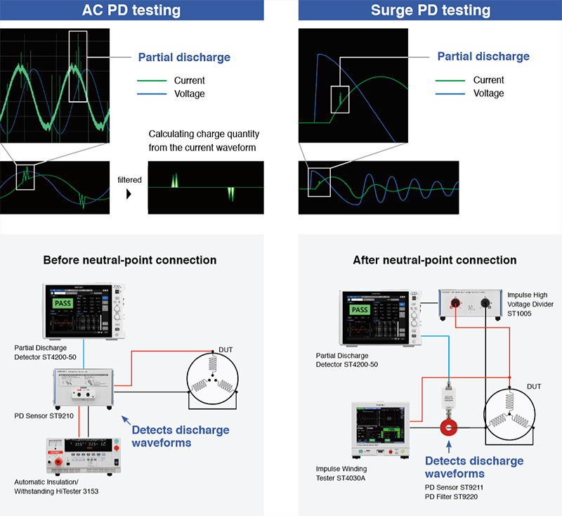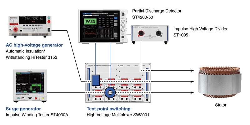 | Control description | Cooperative control of withstanding voltage tester and impulse winding tester used as high-voltage generators for partial discharge testing |