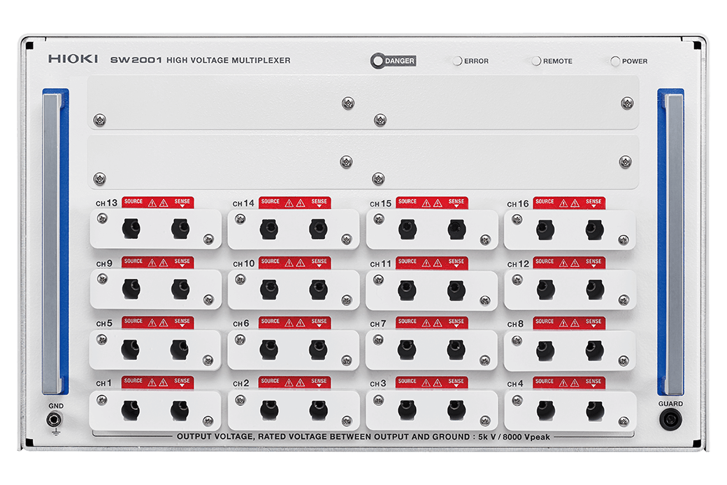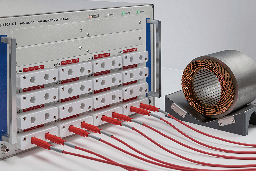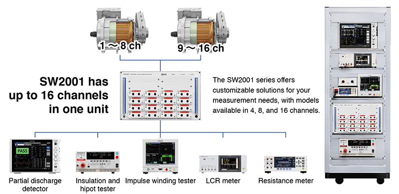 The SW2001 High Voltage Multiplexer is designed to connect multiple testers for six different tests, allowing safe and seamless switching between high-voltage and 4-terminal low-voltage testing. (It is designed to connect testers for the winding resistance test, inductance test, insulation resistance test, hipot test, surge test, and partial discharge test [AC PD and Surge PD].)