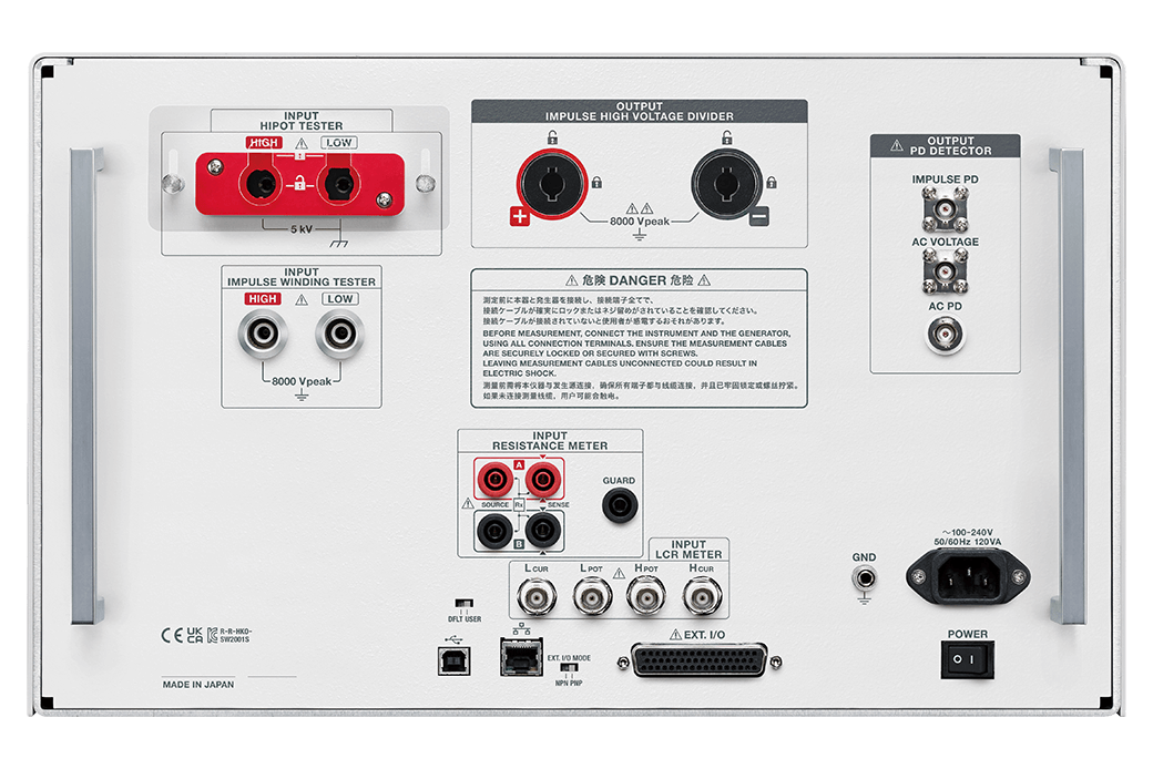 | Maximum input voltage | High-voltage two-terminal input HIPOT (HIPOT TESTER terminal): 5 kV AC rms, 5 kV DC, 7.07 kV peak High-voltage two-terminal input IMPULSE (IMPULSE WINDING TESTER terminal): 8 kV peak (impulse) Low-voltage four-terminal input LCR and RESISTANCE: 30 V AC rms, 60 V DC, 42.4 V peak |