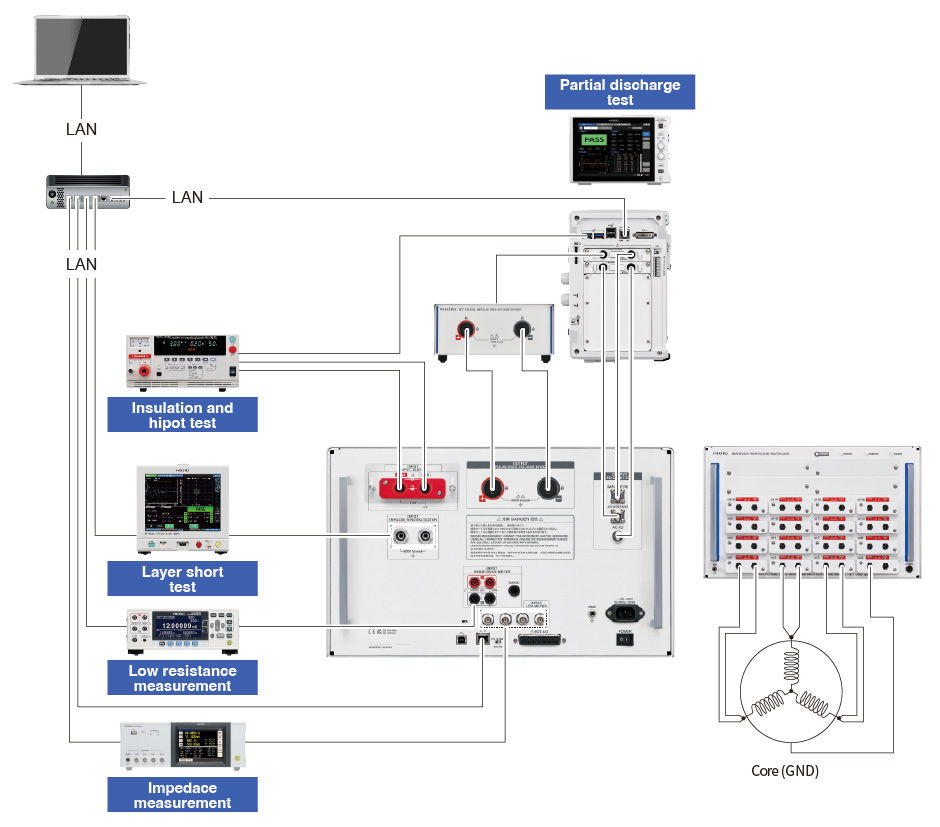 Additionally, Hioki also offers the dedicated multiplexer SW2001, which can integrate all of these electrical inspections and measurement of stators and finished motor products.
